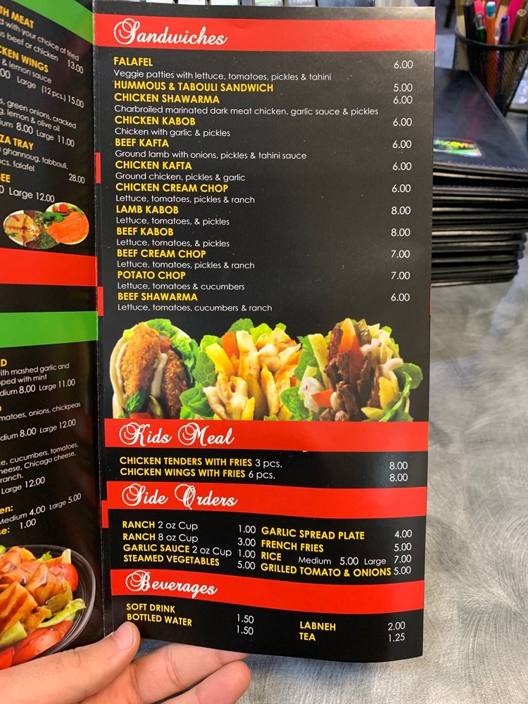 (feeds up to 2 pers.) 1 beef kafta, 1 chicken kafta, 3 chunks of chicken kabob & beef shawarma