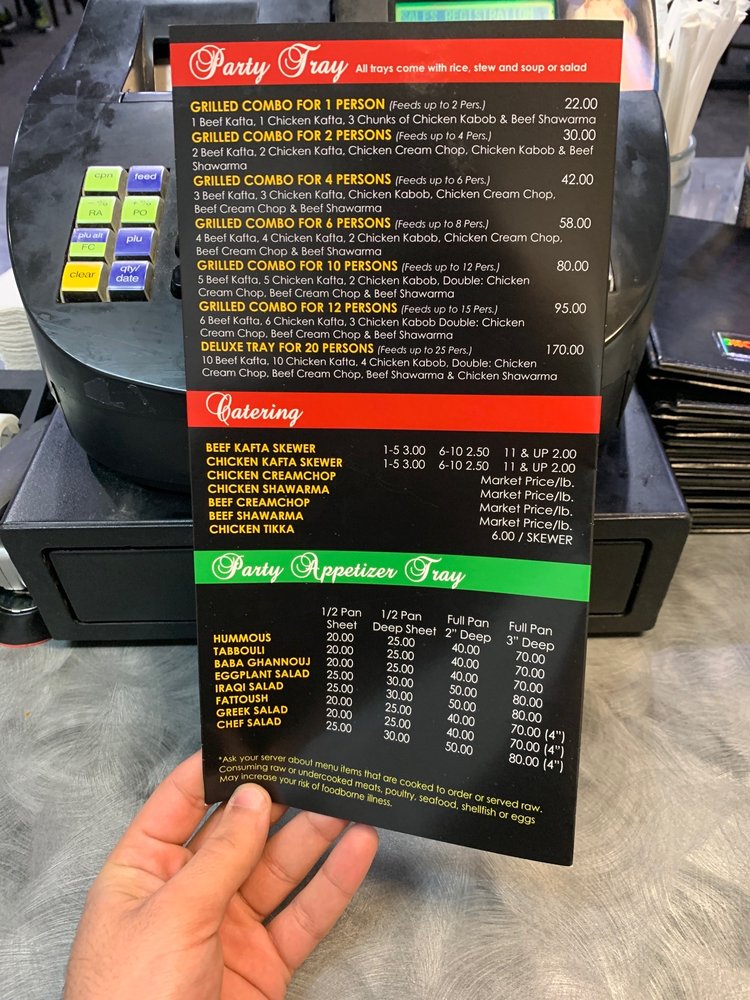 (feeds up to 15 pers.) 6 beef kafta, 6 chicken kafta, 3 chicken kabob, double: chicken cream chop, beef cream chop, beef shawarma & whole rotisserie chicken